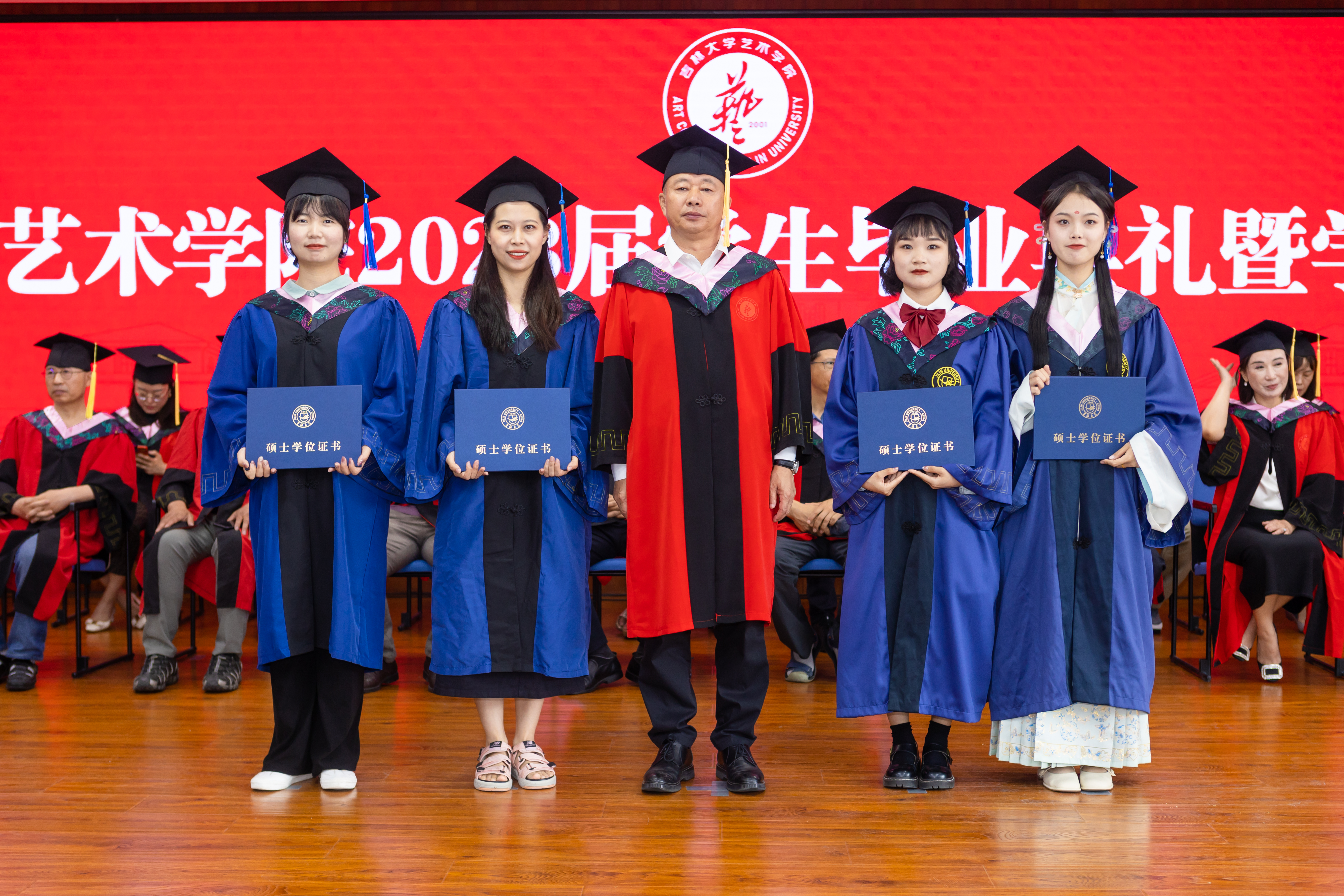 学位授予仪式上。主礼教授郭春方院长为毕业生颁发学位证书;吴向东教授、朱廷丽教授为毕业生拨动流苏;色漫网