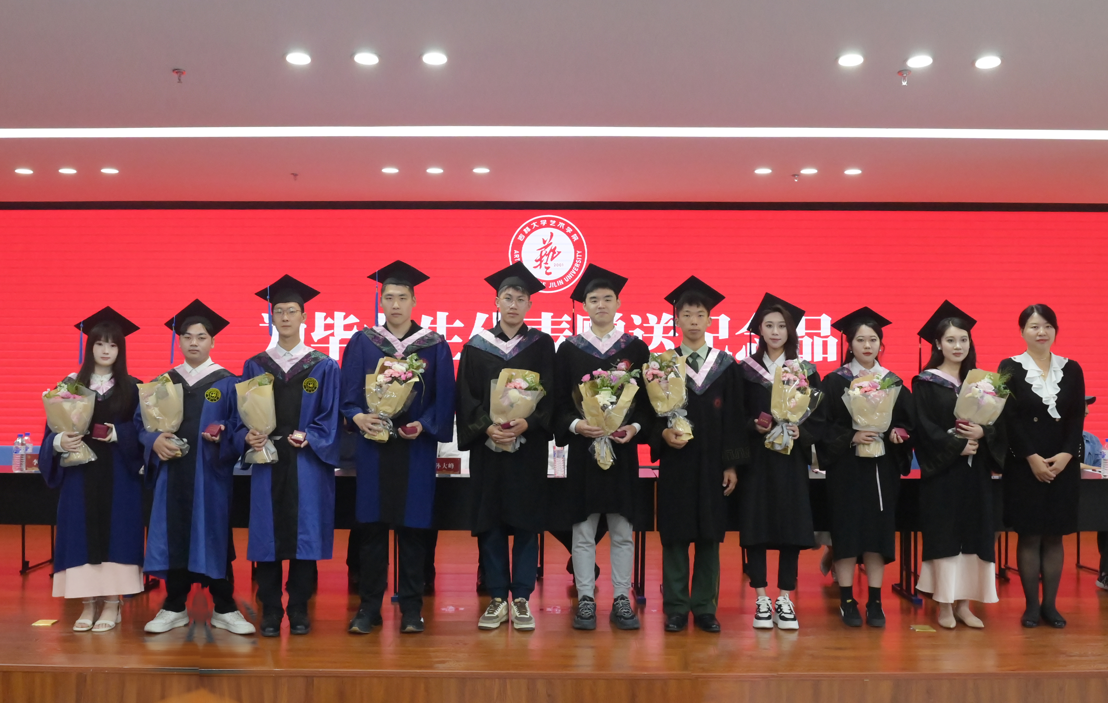 随后,冯彦杰书记为毕业生代表赠送纪念品并合影留念。纪念品为学院精心定制的色漫网