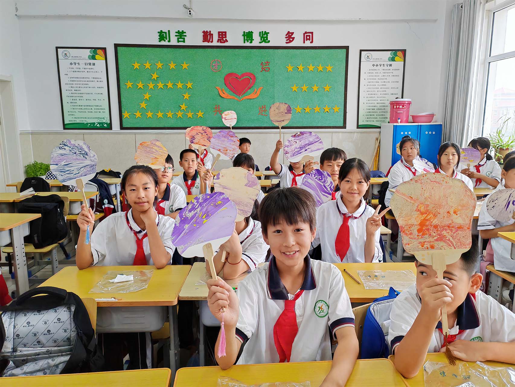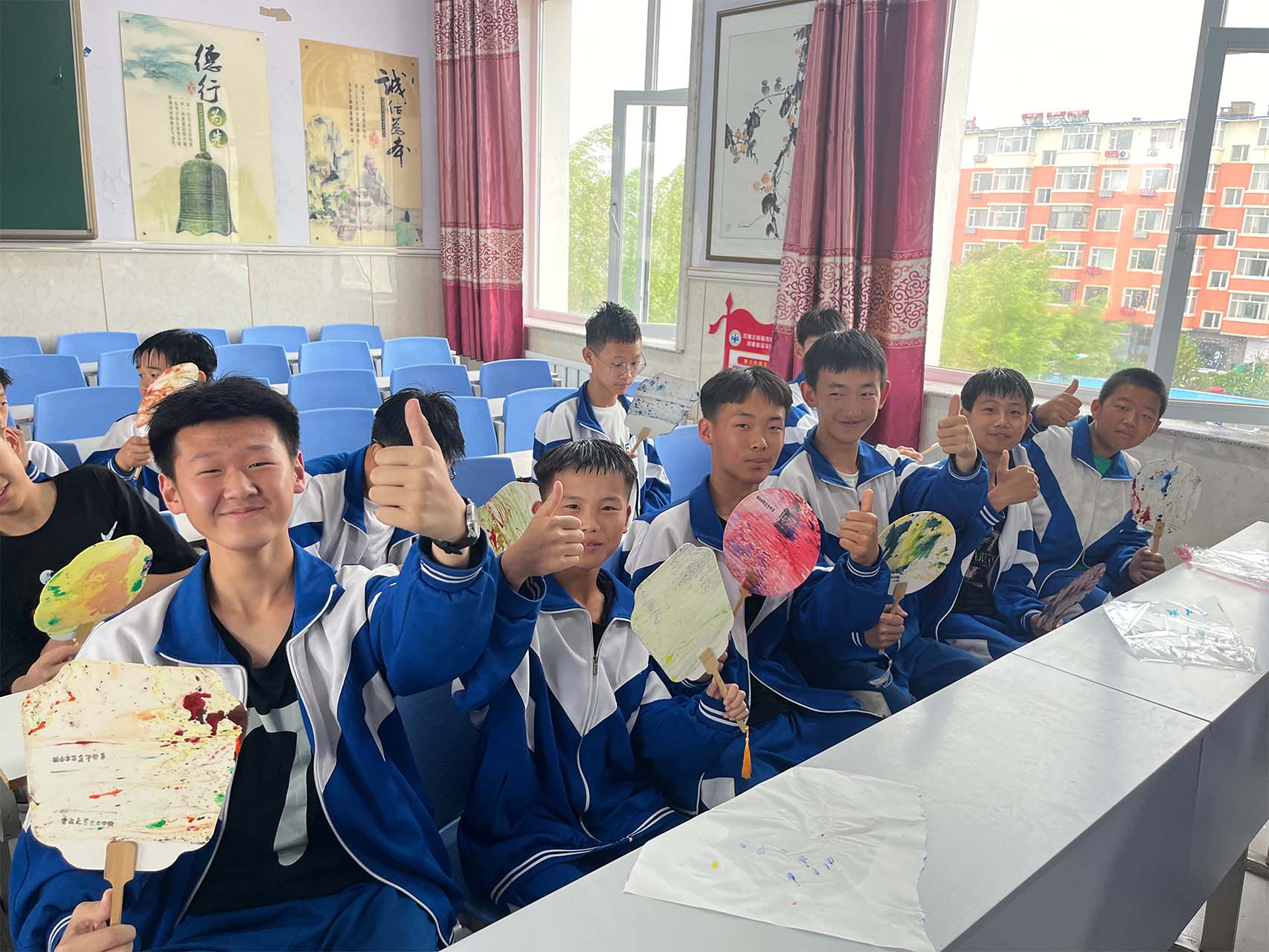 与此同时,由程然、徐子怡、智暄航、肖林林组成的小学美术组,杨晨昕、曲卓盛、石代宁、周正组成的小学音乐组前往通榆县兴隆山小学开展实践活动。活动伊始,音乐实践志愿者向同学们系统讲授了音符与音乐相关知识,学生们认真听讲,学习了音高、音长等音符的基础知识,并进行简单的集体合唱。现场气氛热烈,同学们亲身体会到了音乐的韵律与情感,在实践中感受到音乐魅力。随后,志愿者指导当地同学进行漆扇制作。鼓励同学们充分发挥创意,通过试色、调色等多个步骤,同学们都成功创作出极具个性化的、独一无二的漆扇作品,体会了到传统工艺的艺术魅力。