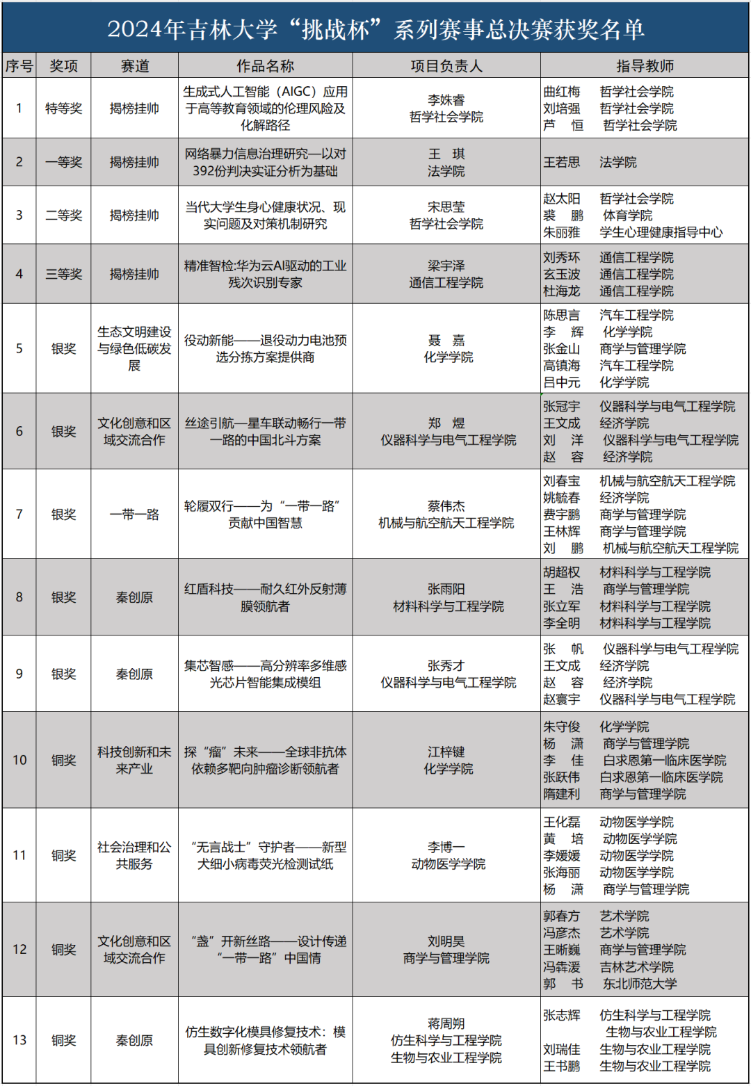 在 2024 年度 “挑战杯” 赛事中所有参赛队伍共斩获 13 个奖项,其中特等奖 1 项,一等奖 1 项,银奖(含二等奖)6 项,铜奖(含三等奖)5 项。