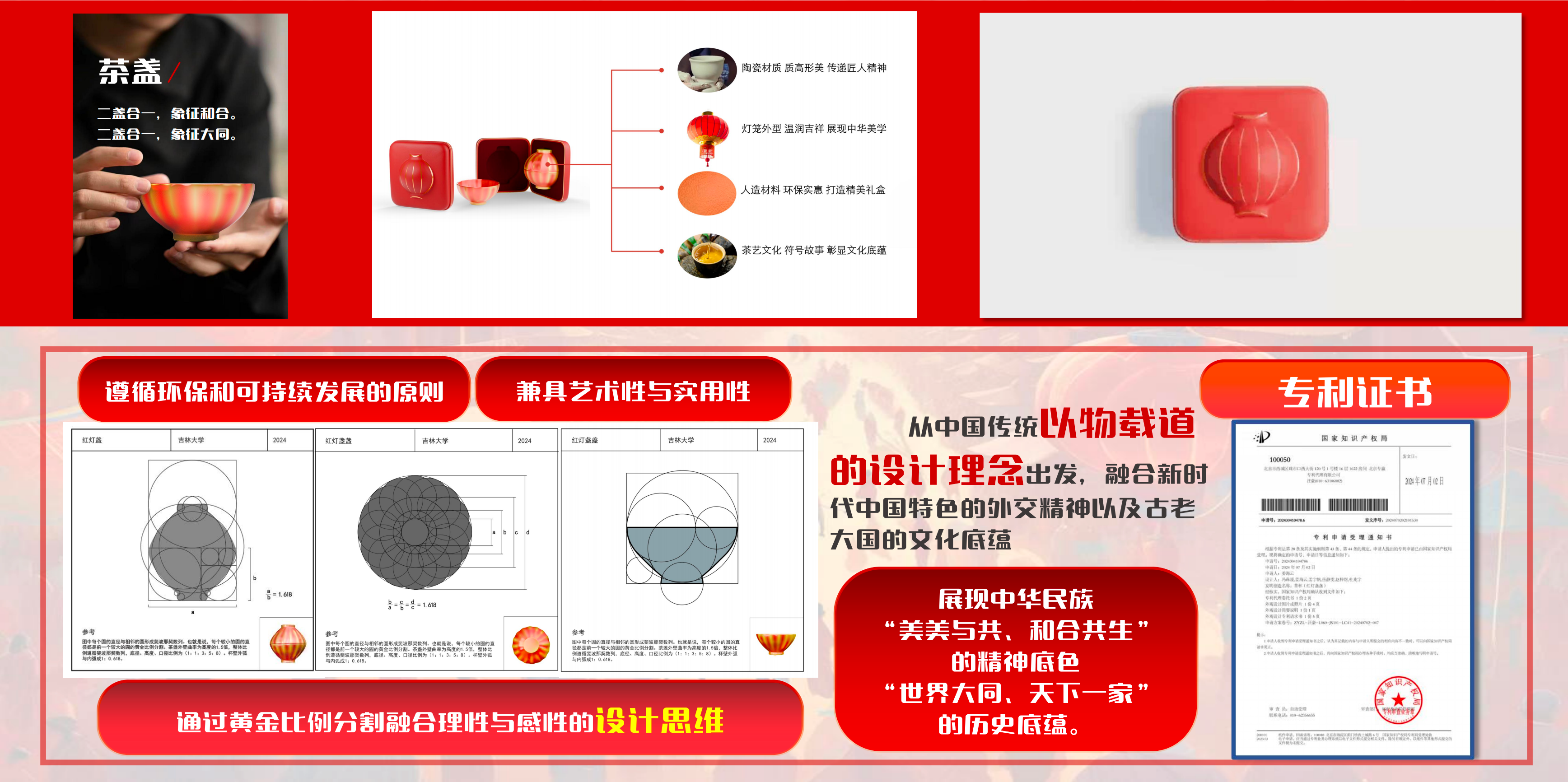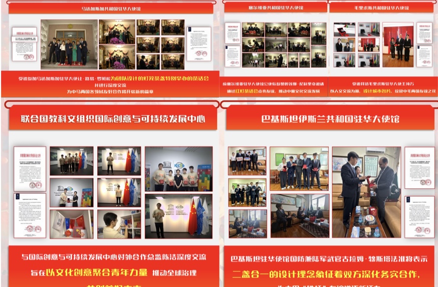 项目灵感源于新中国成立时八只大红灯笼见证历史的场景,团队参考大红灯笼元素设计出一对茶盏,通过线上线下相结合的特色活动,与留学生开展文化交流互鉴。团队将茶盏带到马达加斯加、塞尔维亚、毛里求斯、巴基斯坦等多个 “一带一路” 沿线国家的使馆以及联合国教科文组织国际创意与可持续发展中心,举办红灯茶话会活动,累计赠送 “红灯盏盏耀丝路” 茶盏 300 余套,并与 10 余名驻华大使、高级外交官进行座谈交流,有力地助推了我国与 “一带一路” 沿线国家的经贸往来,还与十余家大型跨国公司签订长期战略合约,以文化为载体促进经贸合作,彰显了扎根中国文化、建立中国自信、打造中国品牌、讲好中国故事的理念。