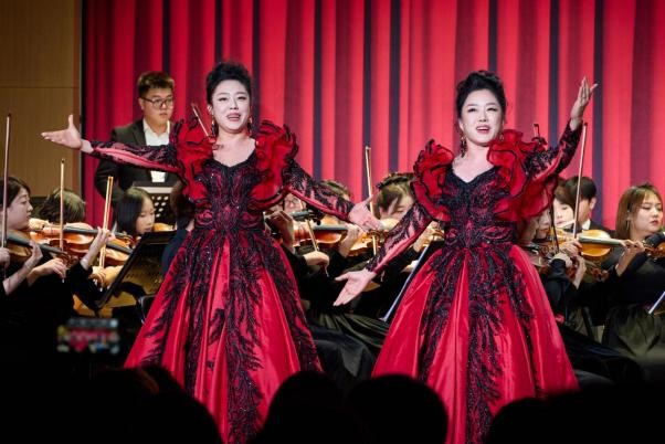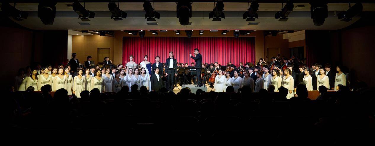 师生共同完成,于洪晨担任交响乐团指挥。音乐会通过管弦乐、独唱、重唱、合唱等多种形式的经典作品为观众呈现了一场视听盛宴。拉赫玛尼诺夫的管弦乐《交响舞曲》为音乐会拉开帷幕,铿锵有力的旋律开场即瞬间点燃现场氛围,引领观众沉浸在浓厚的喜乐气氛中。张洪玉作曲的管弦乐《乡韵》传递出的乡音质朴悠扬,旋律饱含了对家乡的眷恋、对故土的深情。宁馨锐、宁馨磊的女声二重唱《帕米尔我的家乡多么美》融入塔吉克民族音乐元素,歌曲展现出帕米尔高原的壮美风光和军民共建边疆的动人图景。牛建博运用了单簧管的音域变化,通过丰富的音色层次将单簧管协奏曲《俄罗斯舞曲》的独特魅力展现得淋漓尽致。王端端带来的女声独唱《你们可知道什么是爱情》、惠铮(特邀)演唱的经典男声独唱歌曲《黎明》则以细腻的演唱技巧,将歌剧咏叹调与经典艺术歌曲的深层情感娓娓道来,动人心弦。