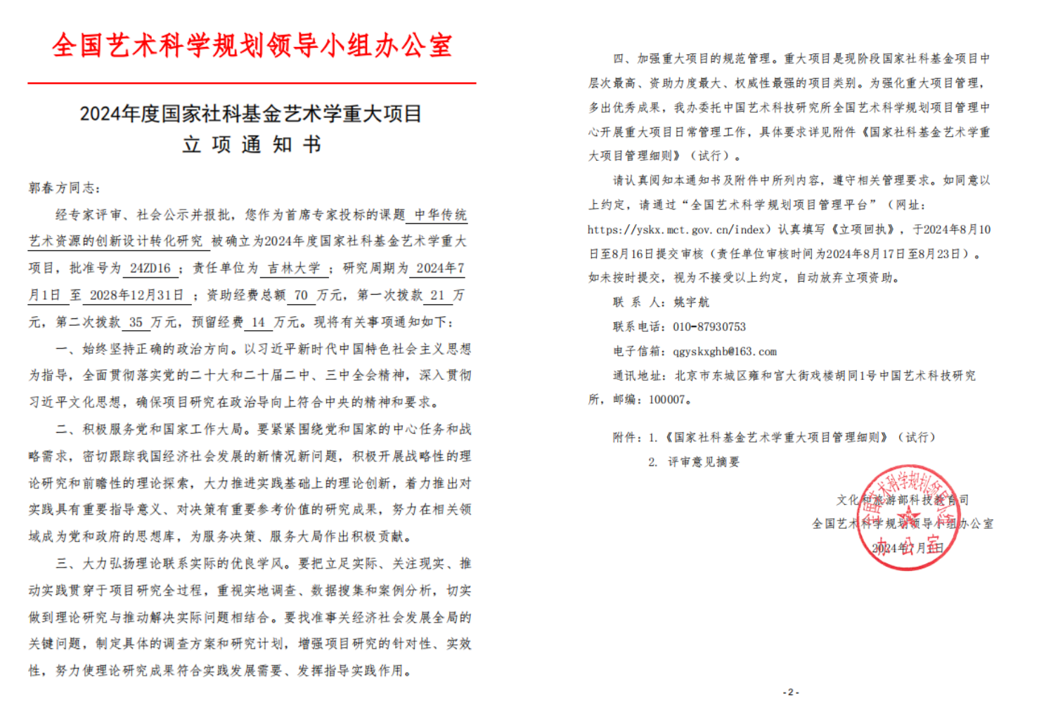 图10 国家社科基金艺术学重大项目《中华传统艺术资源的创新设计转化研究》立项书
