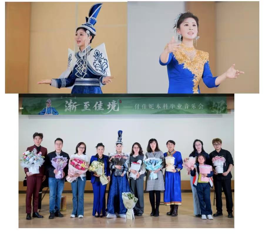 5月13日,2021级付佳妮的“渐至佳境”毕业音乐会率先拉开帷幕。师从宁馨磊副教授的付佳妮在校期间成绩斐然,屡获国家励志奖学金、雅马哈音乐奖学金,并在金钟奖等赛事中表现优异,已成功保送本校攻读硕士学位。音乐会曲目风格多元:上半场涵盖古诗词艺术歌曲《江畔独步寻花》、山东民歌《包楞调》及歌剧选段《胜利时再闻花儿香》;下半场则聚焦蒙古族经典,付佳妮与赵子龙的合唱《幸福的牧马人》《春天》将气氛推向高潮。吉林省知名打击乐演奏员杨爽、长春马头琴协会会长包海龙(市级马头琴传承人)及其团队的倾情助阵,为蒙古族民歌注入了灵魂。