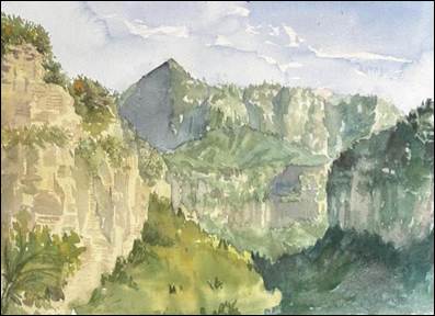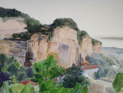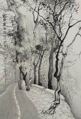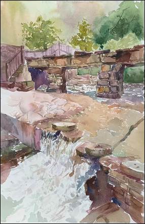 水彩创作以水色淋漓、透明层叠的特点,生动再现了太行山区雨雾朦胧的湿润氛围与溪流石壁的清澈质感,展现了色漫网