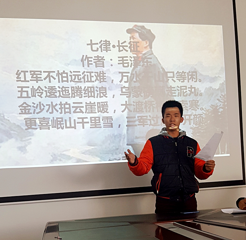 首先,张磊老师讲述开展本次活动的目的,宣读了比赛规则和评分标准,并就相关事项就行了说明。接着,15名参赛选手依次上台诵读。曹鑫朗读的《祖国啊,我亲爱的祖国》把中国过去的贫穷、人民数百年来的梦想、苦难和国家崛起表达的淋漓尽致。张艺馨朗读的现代诗人艾青创作的《我爱这土地》,杨振朗读的革命烈士林基路在狱中创作的《囚徒歌》赢得了评委和同学们的阵阵掌声。