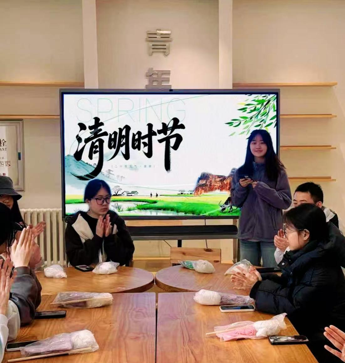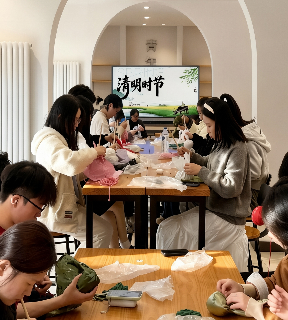 主持人溯源清明文脉,解读传统习俗,阐释艾草“辟秽祛邪、温经通络、益气养生”的文化内涵与药用价值。制作环节,同学们分组围坐,案几上整齐陈列着制作材料。志愿者们现场示范讲解,细致拆解艾叶锤的制作流程,每一个步骤都耐心指导、细致答疑。